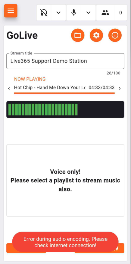 Note: If your streaming device experiences connectivity or network issues and cannot connect to the Live365 station, a detailed error message will display at the bottom of the screen.