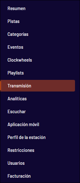 Puedes encontrar la función de Relay en los ajustes de Transmisión dentro del menú de tu estación. Selecciona Transmisión en tu barra de navegación y luego baja hasta que veas los ajustes de Relay.