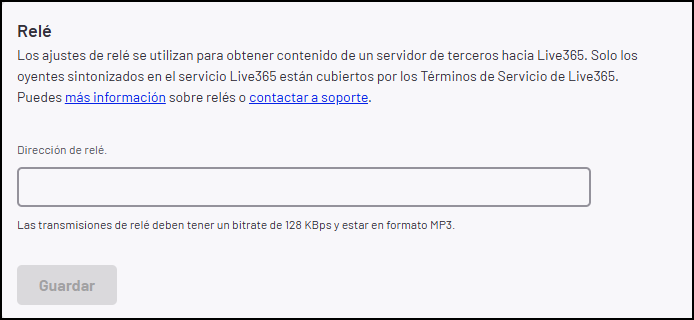 Para hacer otra retransmisión a Live365, ingresa una URL de transmisión existente en el campo de Dirección de Relay en tu cuenta de Live365 y haz clic en el botón de Guardar.