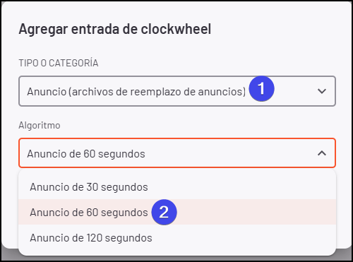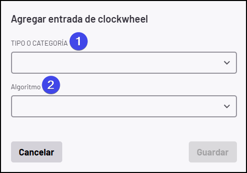 En el primer menú desplegable, elige el Tipo o Categoría (1) que quieres agregar al ClockWheel. Después, selecciona uno de los Algoritmos de selección (2), que ayuda a decidir qué pistas se eligen al crear un evento. Haz clic en el botón verde de Guardar para registrar tu selección.