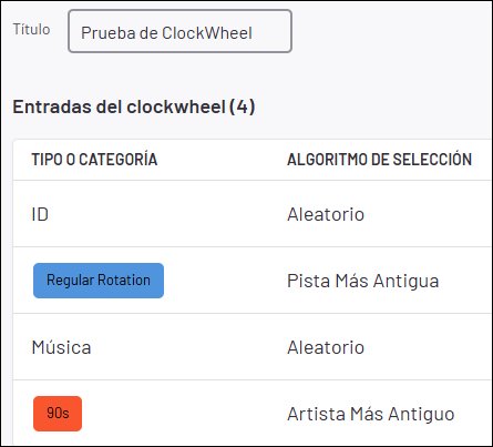 En este ejemplo, tenemos 4 elementos en la línea del ClockWheel. Al programarlos como un evento, el sistema seleccionará pistas al azar y de acuerdo con el algoritmo y las reglas configuradas.