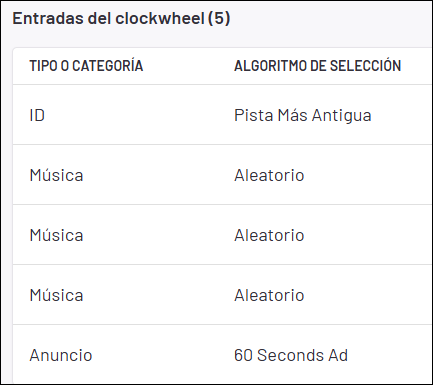 Cuando este ClockWheel se programa, podemos ver el patrón repetitivo: primero se reproduce un ID, luego 3 pistas al azar y finalmente un anuncio de 60 segundos.