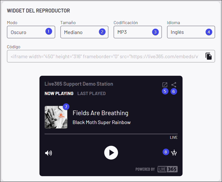 Live365 ofrece un reproductor HTML5 insertable y un widget de últimas reproducciones para tu sitio web. Elige el tamaño y el color que mejor se adapten al estilo y diseño de tu página.