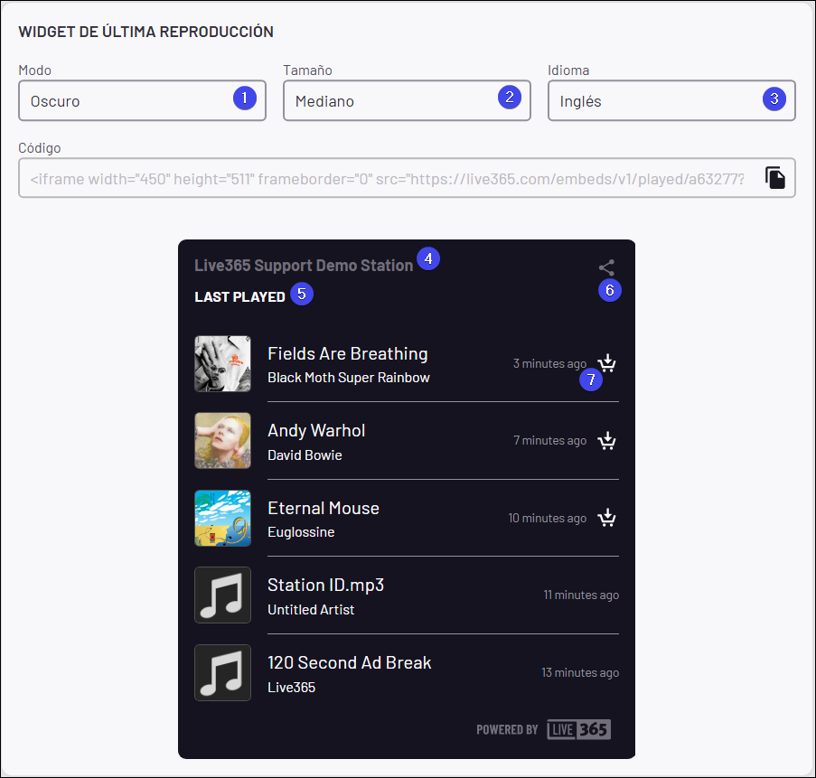 El widget de Últimas Reproducciones de Live365 incluye las siguientes características: