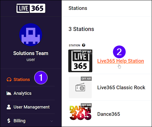 First, make sure you are editing the station where you want to make these changes. Highlight and click the station name to select it. If you are unfamiliar with how to navigate this part of Live365, please see this help article which describes dashboard navigation.