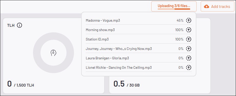 - Once you have added the desired files, click the bottom right Upload button to start uploading. You can monitor the progress by hovering over the status indicator to the left of the Add Tracks button.